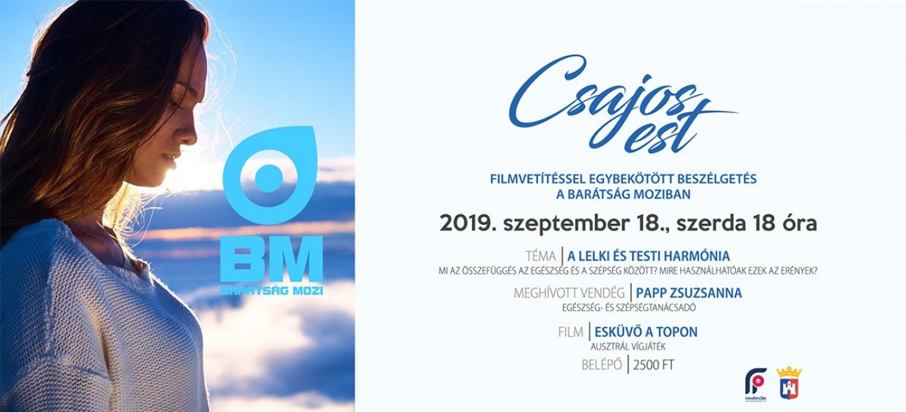 Az egészség és a szépség közötti összefüggések adják a Barátság mozi szeptember 18-i Csajos estjének témáját, a meghívott előadó Papp Zsuzsanna egészség- és szépségtanácsadó. A 18 órakor kezdődő beszélgetés után az Esküvő a topon című ausztrál vígjátékot vetíti a város mozija.
