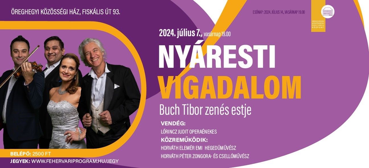 Hagyományos zenés programjára hívja a közönséget a Székesfehérvári Közösségi és Kulturális Központ július 7-én, vasárnap este hét órára az Öreghegyi Közösségi Ház kertjébe: a Nyáresti vigadalom, Buch Tibor és Lőrincz Judit estje jól ismert, örökzöld musical- és operettslágerekkel szórakoztatja a hallgatóságot.
